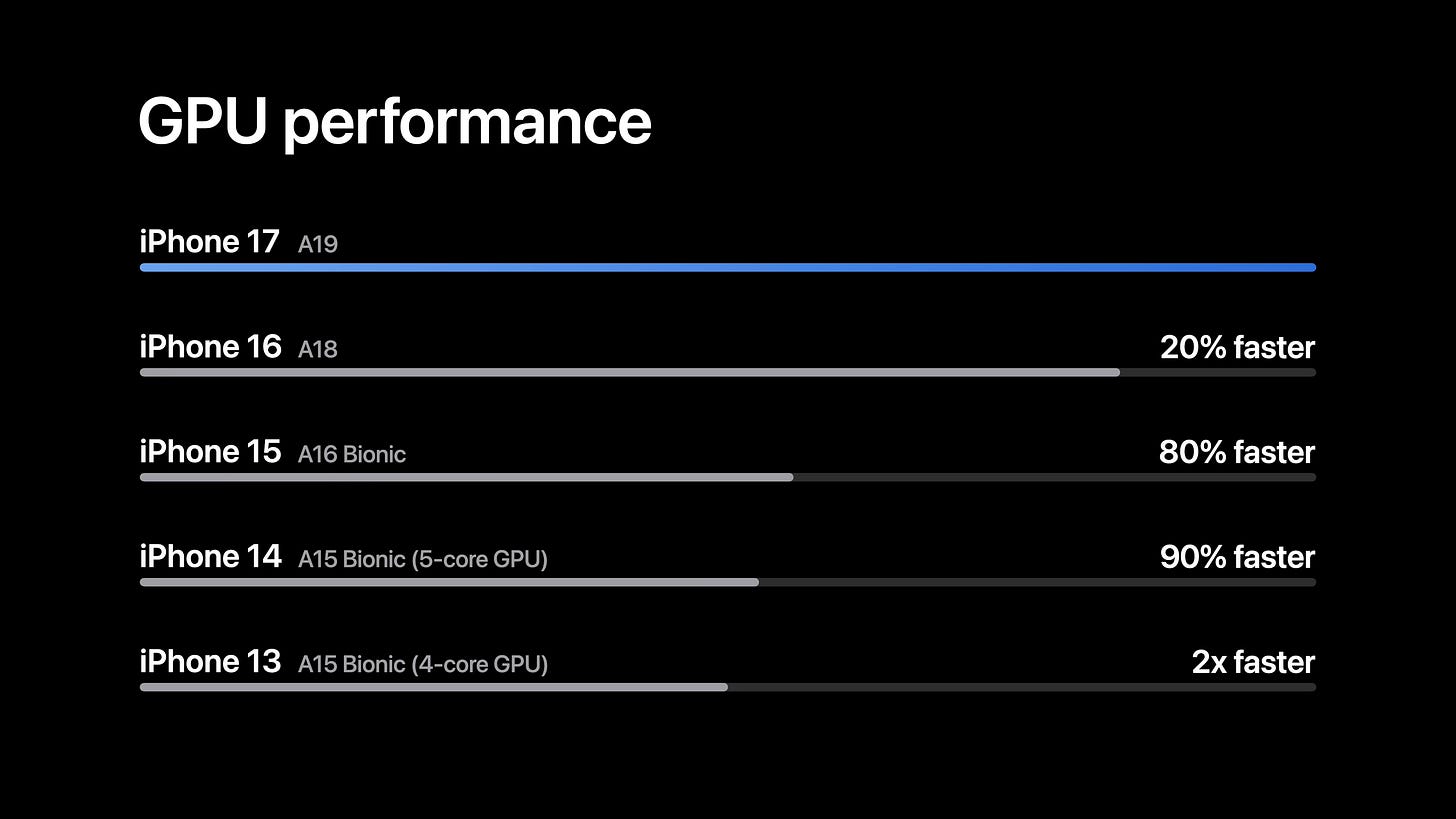 In terms of graphics performance claims, Apple is offering a few different metrics. Comparing the vanilla A19 to last-year’s vanilla A18, Apple is claiming that the iPhone 17 should be around 20% faster in GPU performance than the iPhone 16. Otherwise, compared to the iPhone 15 generation, Apple is claiming that the iPhone 17 is up to 80% faster than the iPhone 15, and the iPhone 17 Pro is up to 50% faster than the iPhone 15 Pro.