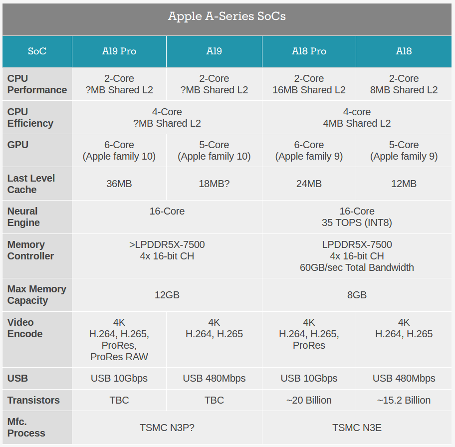 On the memory front, Apple has confirmed that the A19 chips have more memory bandwidth, but not to what degree. The A18 family of chips shipped with LPDDR5X-7500, and a year later LPDDR5X is readily available at speeds over 8000 MT/sec. So it’s all but given that Apple will be using faster memory – the only question is how much faster?