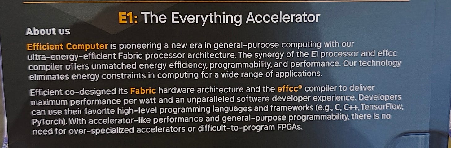 The numbers they're throwing around are, frankly, somewhat insane. Efficient Computer claims up to 100 times better energy efficiency than ARM's best embedded cores. My ears perked up when they told me they now have working silicon, soon to be available to developers. The fact that this is still a seed startup with its initial funding from Eclipse Ventures showcases it isn't just another academic exercise, even if a number of executives herald from an academic background.